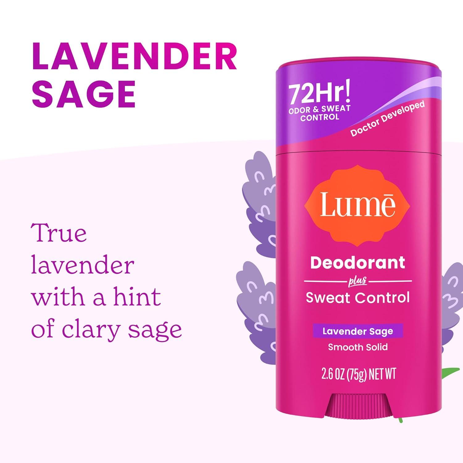 Lume Deodorant Plus Sweat Control – Smooth Solid Stick – Maximum Strength Antiperspirant – 72 Hour Odor And Sweat Control – Baking Soda Free, Skin Loving – 2.6 ounce (Clean Tangerine) Pack of 2(Lavender Sage)