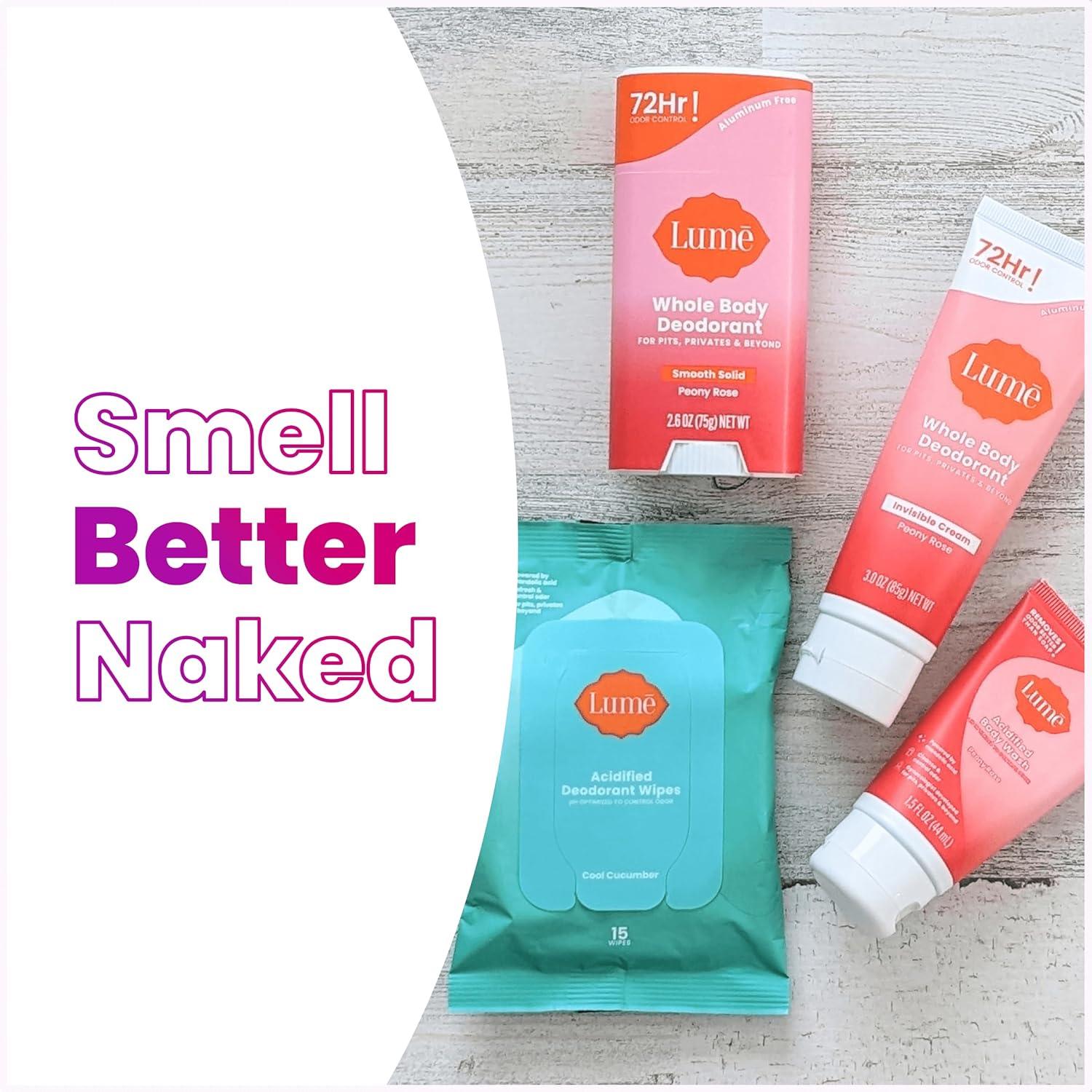 Lume Skin Care Gift Set for Women, Whole Body Deodorant Starter Pack – Smooth Solid Stick, Invisible Cream Tube, Acidified Body Wash Mini & Deodorant Wipes – Aluminum Free Odor Control (Peony Rose)(Peony Rose)