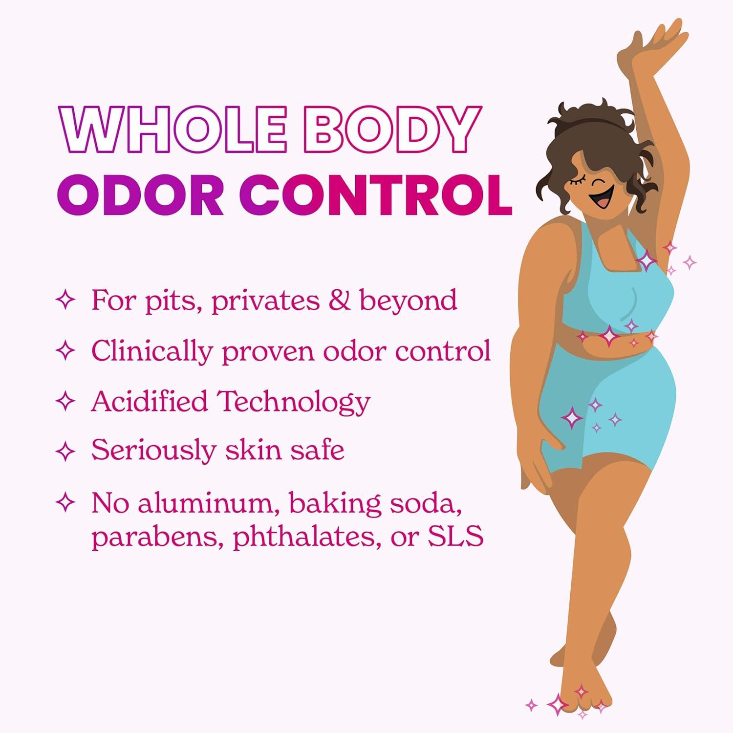EVERYTHING YOU NEED TO SMELL BETTER EVERYWHERE – Odor control for pits, privates and beyond—think feet, underboob, belly buttons, tummy folds, butt cracks, thigh creases or anywhere else you have odor but wish you didn’t.