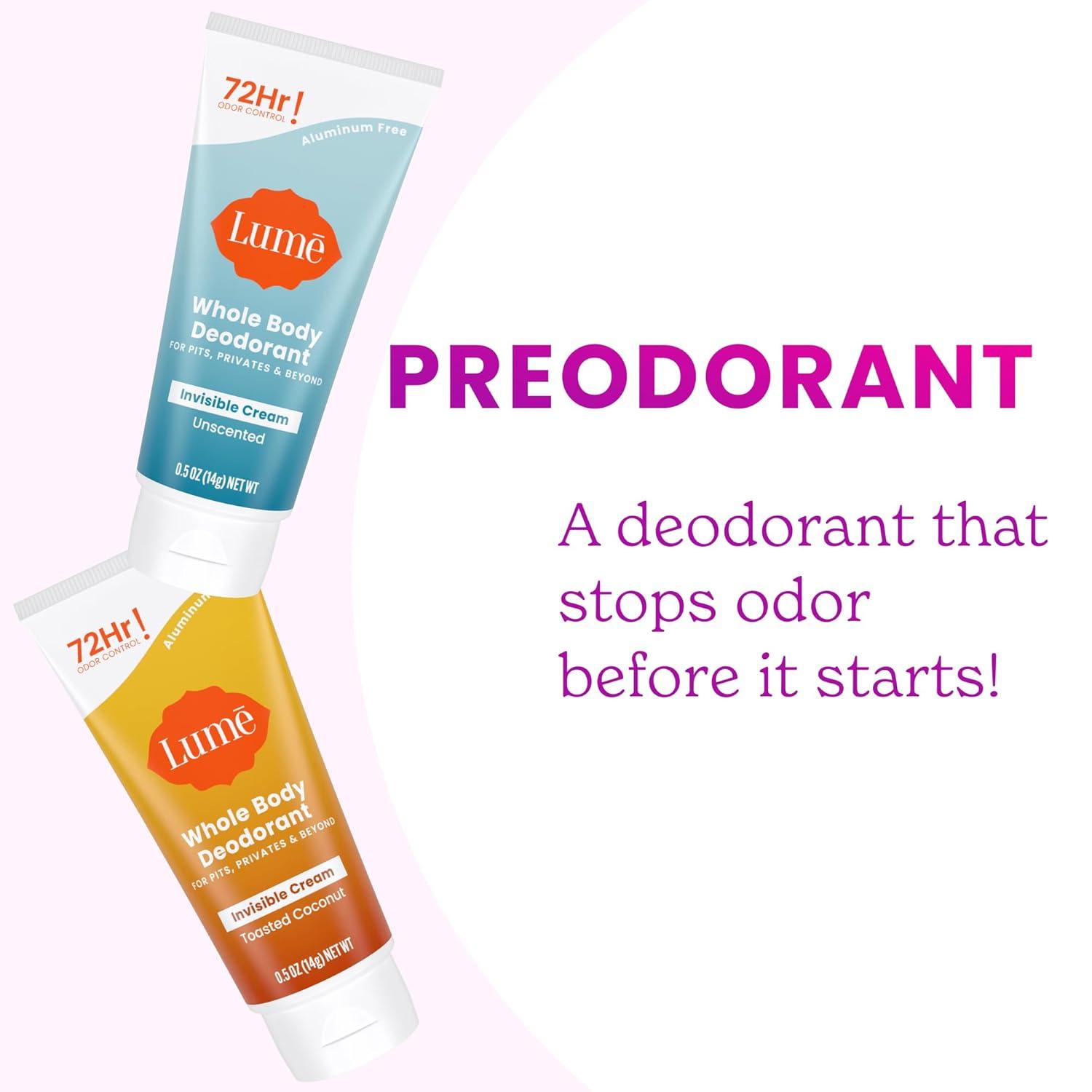 Lume Whole Body Deodorant 5 Pack Sampler – Invisible Cream Minis – 72 Hour Odor Control – Aluminum & Baking Soda Free (Clean Tangerine, Lavender Sage, Peony Rose, Toasted Coconut, Unscented)(Toasted Coconut & Unscented)
