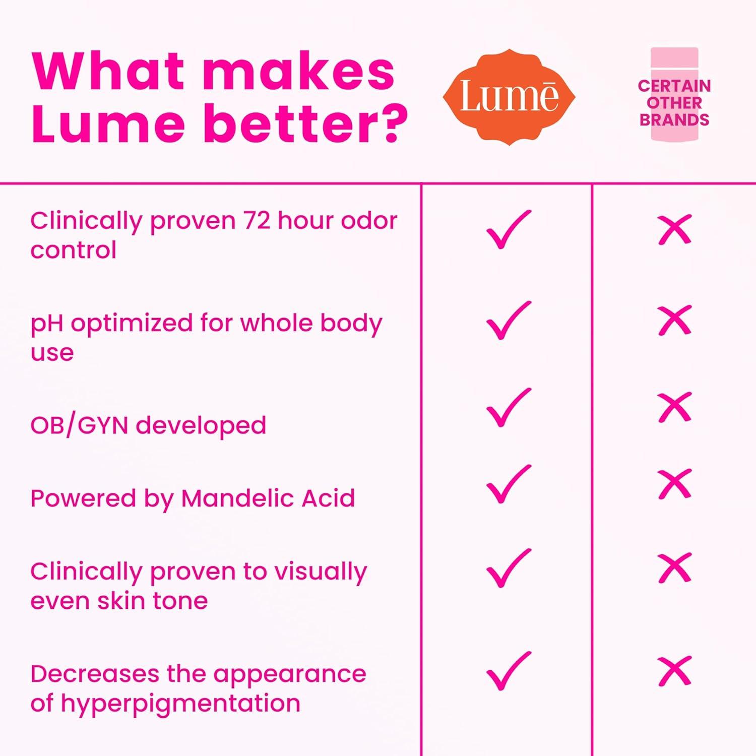 OUTRAGEOUSLY EFFECTIVE – Lume Deodorant is clinically proven to control odor for 72 hours. It is also proven to exfoliate, visually even skin tone, and decrease the appearance of hyperpigmentation.