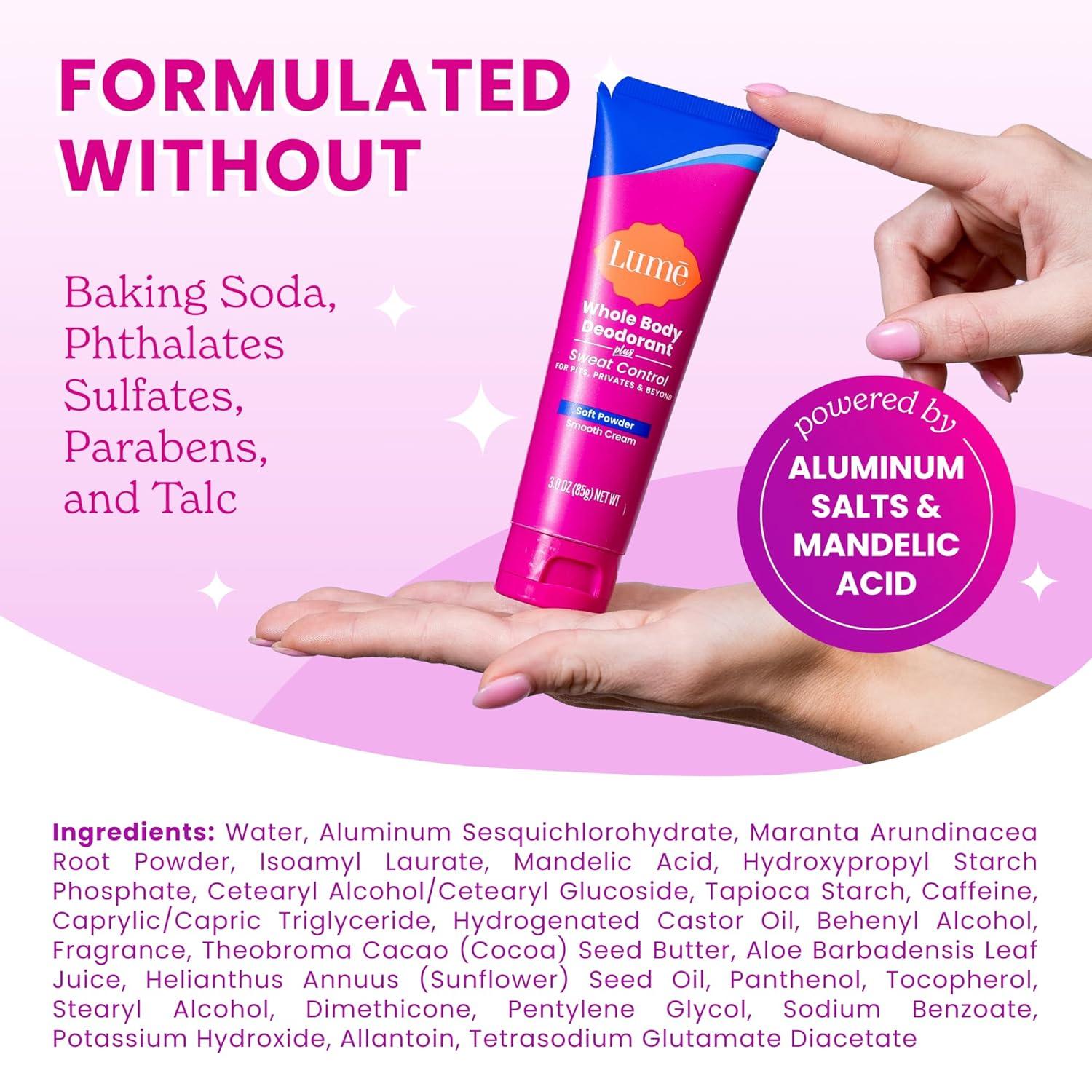 Lume Whole Body Deodorant Plus Sweat Control – Smooth Cream Tube – 72 Hour Odor And Sweat Control – Baking Soda Free, Skin Loving – 3.0 ounce (Pack of 2) (Soft Powder)(-Soft Powder)